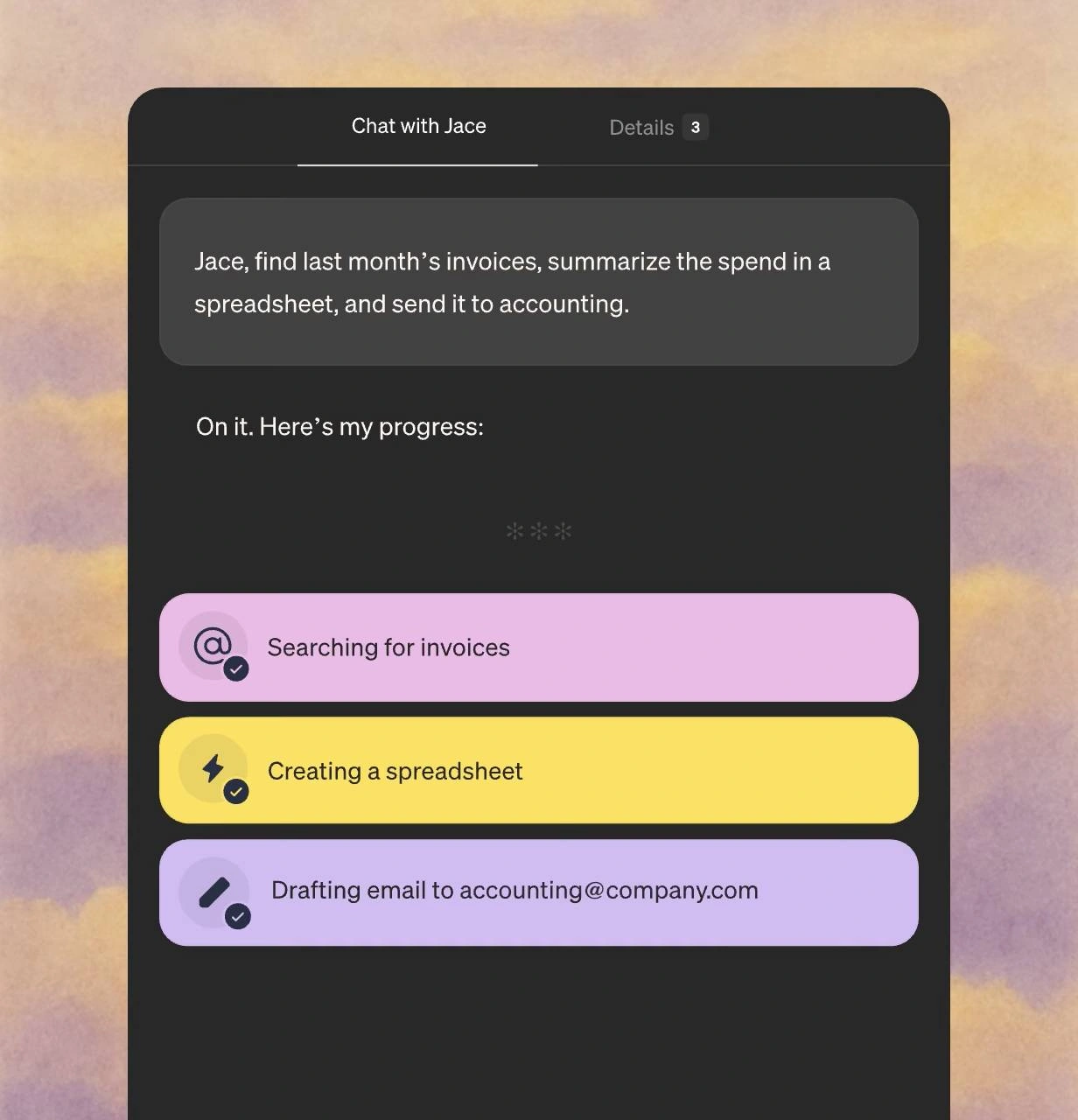 Chat with Jace to fetch data, create docs, and automate tasks.